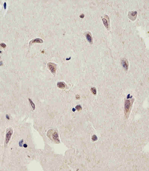 Immunohistochemical analysis of paraffin-embedded H.brain section using C13orf30 Antibody (C-term)(Cat#P32628). P32628 was diluted at 1:25 dilution. A peroxidase-conjugated goat anti-rabbit IgG at 1:400 dilution was used as the secondary antibody, followed by DAB staining. |