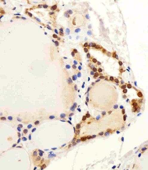 Immunohistochemical analysis of paraffin-embedded H.thyroid section using C13orf30 Antibody (C-term)(Cat#P32628). P32628 was diluted at 1:25 dilution. A peroxidase-conjugated goat anti-rabbit IgG at 1:400 dilution was used as the secondary antibody, followed by DAB staining. |
