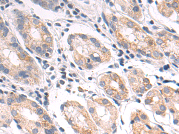 The image is immunohistochemistry of paraffin-embedded Human gastric cancer tissue using P13813(C1QBP Antibody) at dilution 1/50. (Original magnification: ×200) |