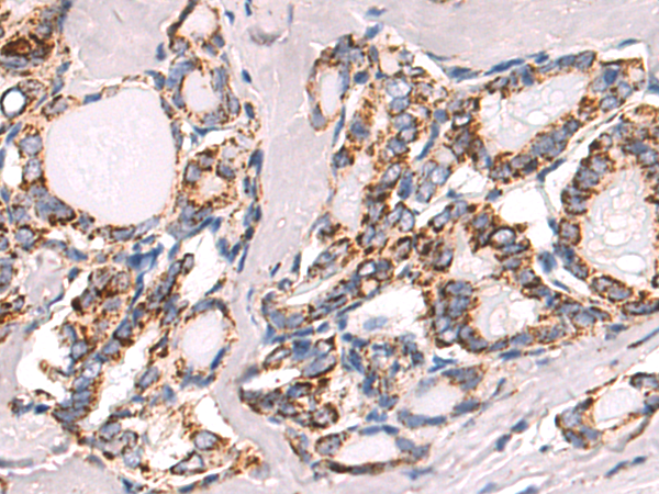 The image is immunohistochemistry of paraffin-embedded Human thyroid cancer tissue using P06928(C1QBP Antibody) at dilution 1/50. (Original magnification: ×200) |