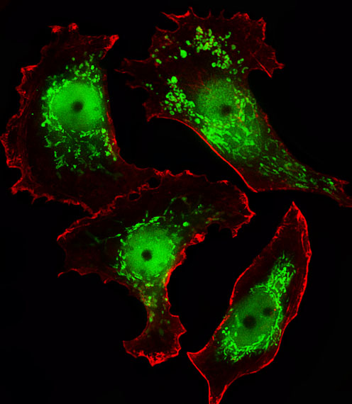 Fluorescent image of MCF-7 cells stained with C21orf33 Antibody (Center)(Cat#P32670). P32670 was diluted at 1:25 dilution. An Alexa Fluor 488-conjugated goat anti-rabbit lgG at 1:400 dilution was used as the secondary antibody (green). Cytoplasmic actin was counterstained with Alexa Fluor® 555 conjugated with Phalloidin (red). |