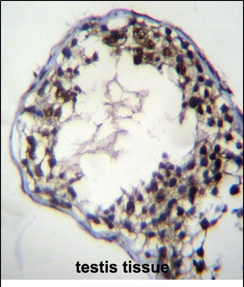 C7orf63 Antibody (N-term) (Cat. #P31086)immunohistochemistry analysis in formalin fixed and paraffin embedded human testis tissue followed by peroxidase conjugation of the secondary antibody and DAB staining.This data demonstrates the use of C7orf63 Antibody (N-term) for immunohistochemistry. Clinical relevance has not been evaluated. |