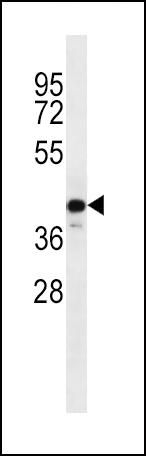 C9orf72 Antibody (C-term) (Cat.# P32563) western blot analysis in WiDr cell lysate (35ug/lane). This demonstrates that the C9orf72 antibody detected C9orf72 protein (arrow). |