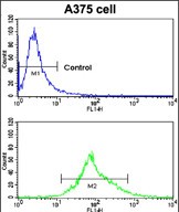Flow cytometric analysis of A375 cells using CA14 Antibody (N-term) (bottom histogram) compared to a negative control cell (top histogram). FITC-conjugated goat-anti-rabbit secondary antibodies were used for the analysis. |