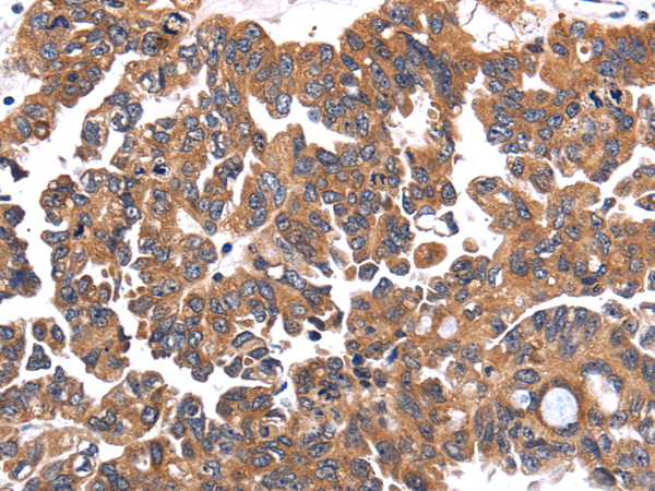 The image is immunohistochemistry of paraffin-embedded Human ovarian cancer tissue using P07158(CA4 Antibody) at dilution 1/30. (Original magnification: ×200) |