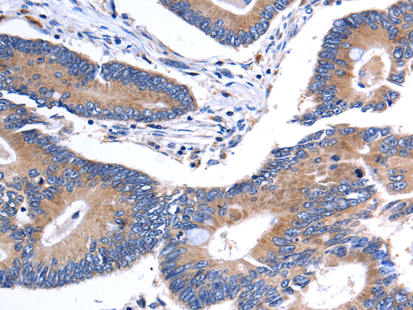 The image is immunohistochemistry of paraffin-embedded Human colon cancer tissue using P07158(CA4 Antibody) at dilution 1/30. (Original magnification: ×200) |