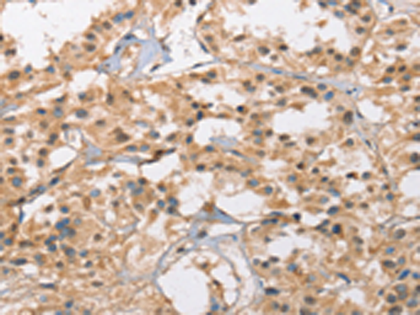 The image is immunohistochemistry of paraffin-embedded Human thyroid cancer tissue using P11614(CACNA1D Antibody) at dilution 1/40. (Original magnification: ×200) |