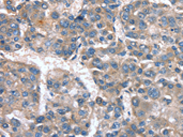 The image is immunohistochemistry of paraffin-embedded Human liver cancer tissue using P11616(CACNA1G Antibody) at dilution 1/20. (Original magnification: ×200) |