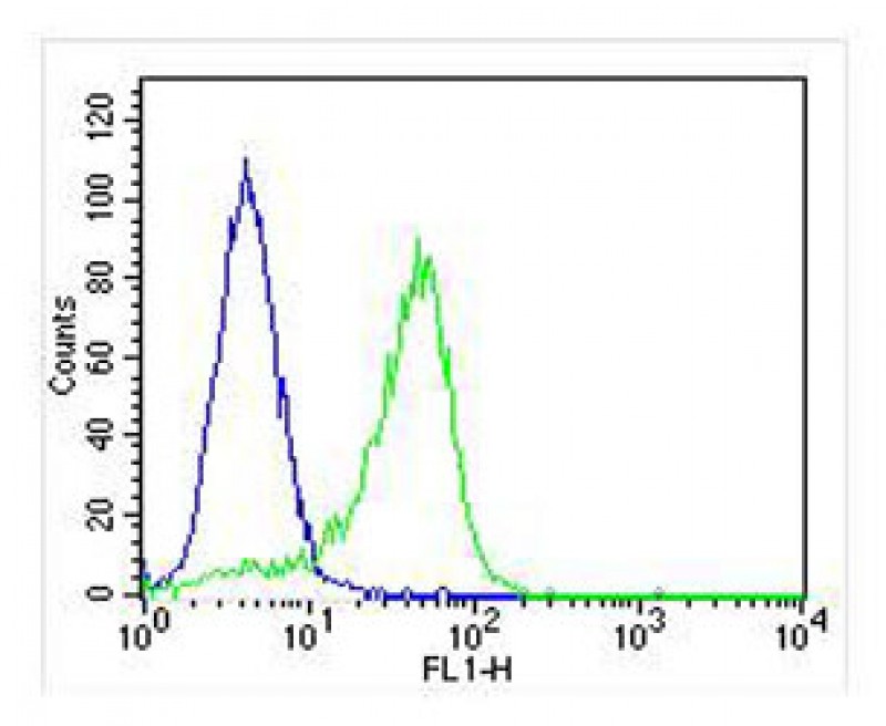 Overlay histogram showing Hela cells stained with P33461 (green line). The cells were fixed with 2% paraformaldehyde (10 min) and then permeabilized with 90% methanol for 10 min. The cells were then icubated in 2% bovine serum albumin to block non-specific protein-protein interactions followed by the antibody (P33461, 1:25 dilution) for 60 min at 37ºC. The secondary antibody used was Goat-Anti-Rabbit IgG, DyLight® 488 Conjugated Highly Cross-Adsorbed(OH191631) at 1/400 dilution for 40 min at 37ºC. Isotype control antibody (blue line) was rabbit IgG (1μg/1×10^6 cells) used under the same conditions. Acquisition of >10, 000 events was performed. |