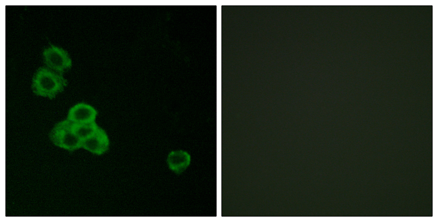 Immunofluorescence analysis of CaMKII alpha/delta in MCF-7 using CaMK2 alpha/delta antibody. The picture on the right is blocked using the synthesized peptide. |