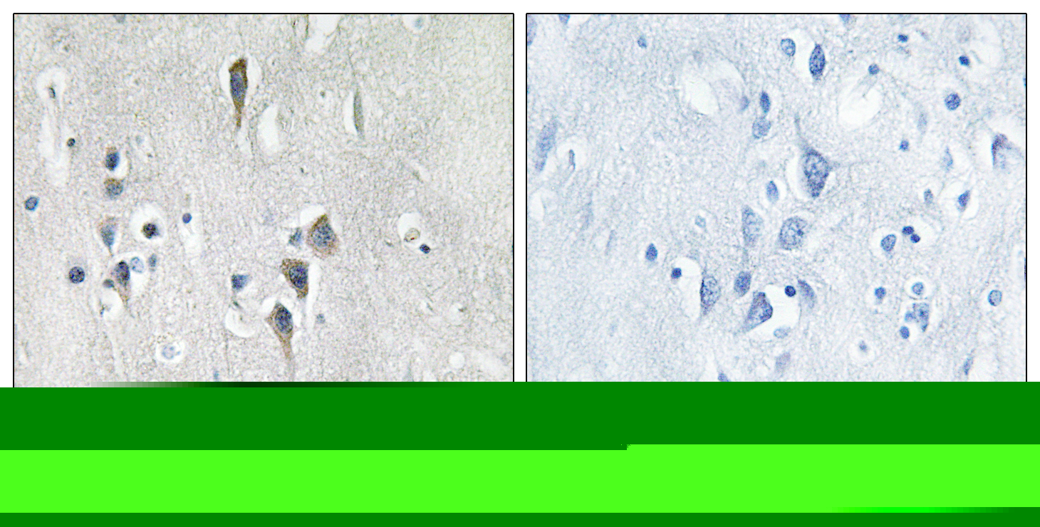 Immunohistochemistry analysis of paraffin-embedded Human brain tissue using CaMK2 alpha/delta antibody. High-pressure and temperature Sodium Citrate pH 6.0 was used for antigen retrieval. Sample with blocking peptide on the right. |