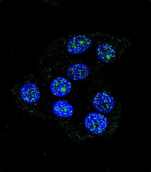 Confocal immunofluorescent analysis of CCDC36 Antibody (C-term)(Cat#P32572) with 293 cell followed by Alexa Fluor 488-conjugated goat anti-rabbit lgG (green). DAPI was used to stain the cell nuclear (blue). |