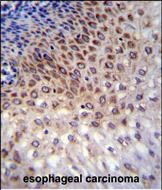CCDC36 Antibody (C-term) (Cat. #P32572)immunohistochemistry analysis in formalin fixed and paraffin embedded human esophageal carcinoma followed by peroxidase conjugation of the secondary antibody and DAB staining.This data demonstrates the use of CCDC36 Antibody (C-term) for immunohistochemistry. Clinical relevance has not been evaluated. |