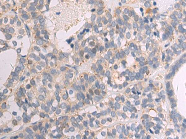 The image is immunohistochemistry of paraffin-embedded Human thyroid cancer tissue using P03802(CCL17 Antibody) at dilution 1/50. (Original magnification: ×200) |