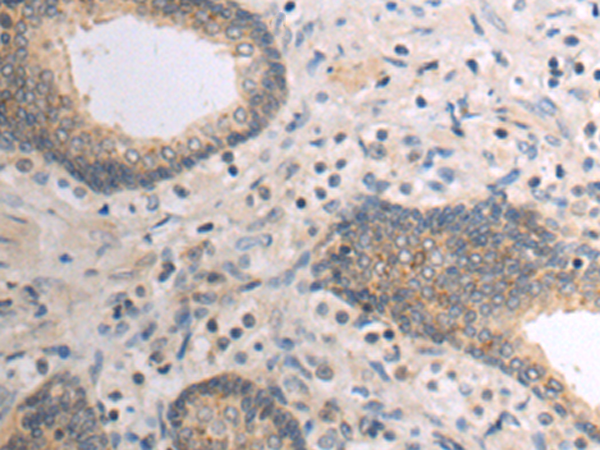 The image is immunohistochemistry of paraffin-embedded Human prostate cancer tissue using P03802(CCL17 Antibody) at dilution 1/50. (Original magnification: ×200) |