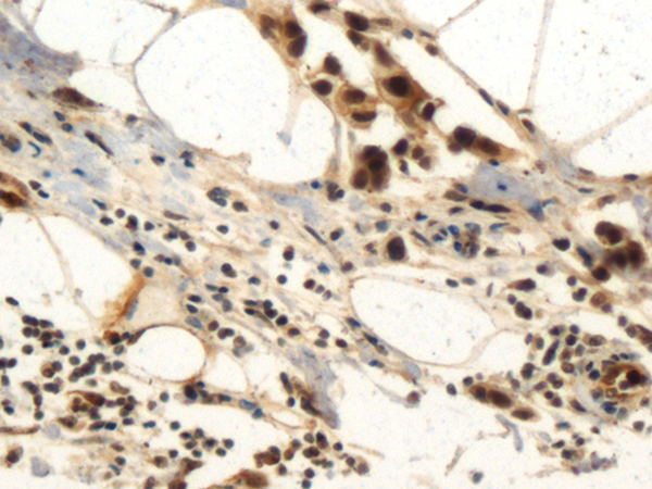 The image is immunohistochemistry of paraffin-embedded Human breast cancer tissue using P07233(CCNA1 Antibody) at dilution 1/50. (Original magnification: ×200) |