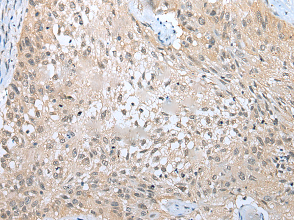 The image is immunohistochemistry of paraffin-embedded Human lung cancer tissue using P12556(CCNT2 Antibody) at dilution 1/20. (Original magnification: ×200) |