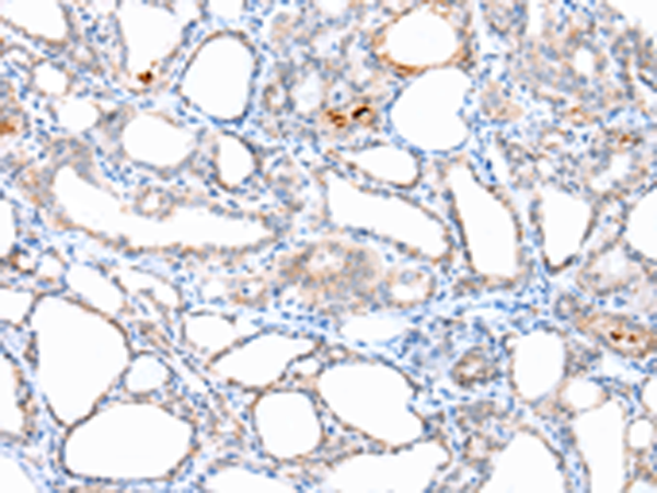 The image is immunohistochemistry of paraffin-embedded Human thyroid cancer tissue using P05600(CCR6 Antibody) at dilution 1/20. (Original magnification: ×200) |