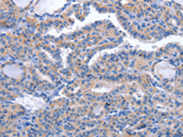 The image is immunohistochemistry of paraffin-embedded Human thyroid cancer tissue using P11631(CCR6 Antibody) at dilution 1/50. (Original magnification: ×200) |