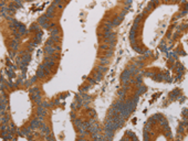 The image is immunohistochemistry of paraffin-embedded Human colon cancer tissue using P03804(CCR8 Antibody) at dilution 1/20. (Original magnification: ×200) |