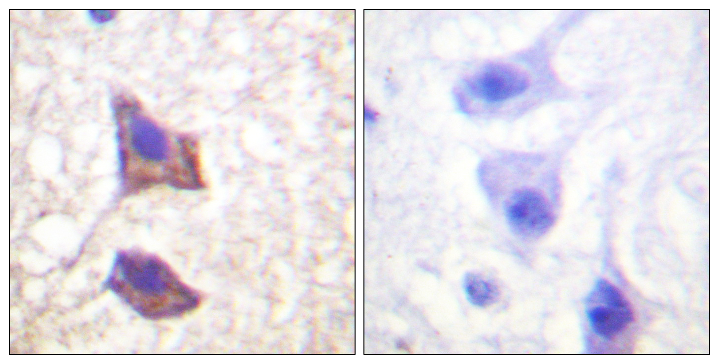 Immunohistochemistry analysis of paraffin-embedded human brain using CD130 antibody.High-pressure and temperature Sodium Citrate pH 6.0 was used for antigen retrieval.Sample with blocking peptide on the right. |