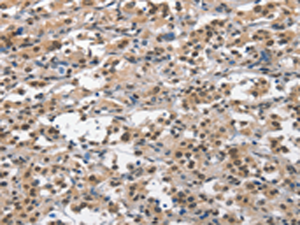The image is immunohistochemistry of paraffin-embedded Human gasrtic cancer tissue using P11246(CD163 Antibody) at dilution 1/30. (Original magnification: ×200) |