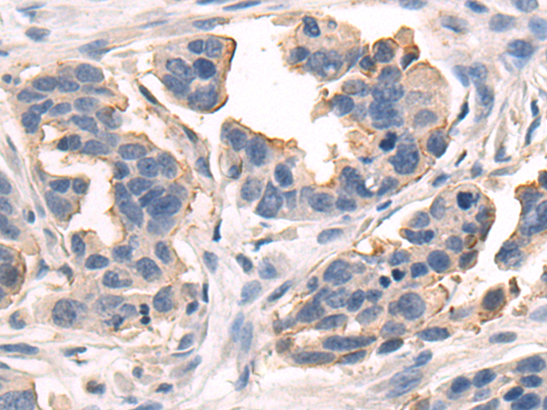 The image is immunohistochemistry of paraffin-embedded Human colorectal cancer tissue using P12968(CD274 Antibody) at dilution 1/50. (Original magnification: ×200) |