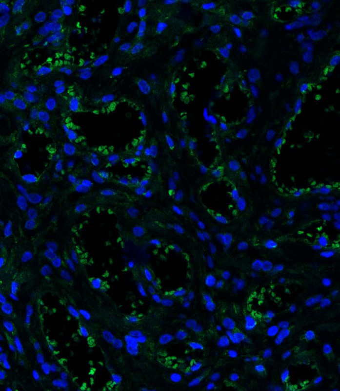 Immunofluorescent analysis of 4% paraformaldehyde-fixed, 0.1% Triton X-100 permeabilized human haemangioma tissue labeling CD34 with P32841 at 1/25 dilution, followed by Alexa Fluor 488-conjugated goat anti-rabbit IgG secondary antibody at 1/400 dilution (green). Confocal image showing membrane staining on human haemangioma tissue. The nuclear counter stain is DAPI (blue). |