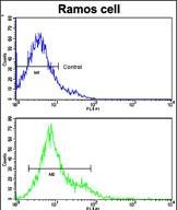 Flow cytometric analysis of Ramos cells using CD3Z Antibody (N-term) (bottom histogram) compared to a negative control cell (top histogram). FITC-conjugated goat-anti-rabbit secondary antibodies were used for the analysis. |