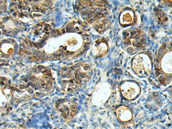 The image is immunohistochemistry of paraffin-embedded Human gastric cancer using P11490(CD44 Antibody) at dilution 1/45. (Original magnification: ×200) |