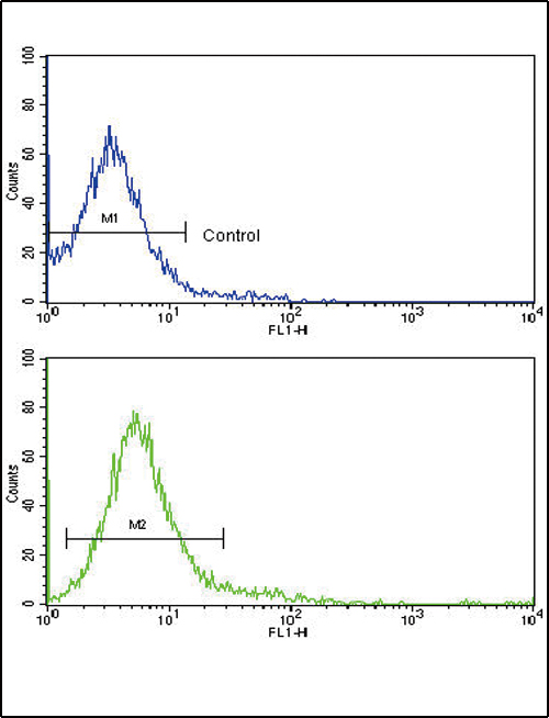 Flow cytometric analysis of jurkat cells using CD45 Antibody (C-term)(bottom histogram) compared to a negative control cell (top histogram). FITC-conjugated goat-anti-rabbit secondary antibodies were used for the analysis. |