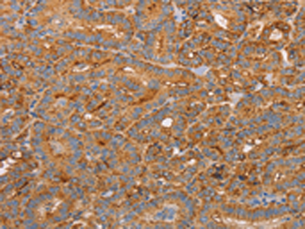 The image is immunohistochemistry of paraffin-embedded Human thyroid cancer tissue using P04759(CD59 Antibody) at dilution 1/50. (Original magnification: ×200) |