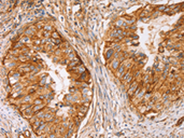 The image is immunohistochemistry of paraffin-embedded Human cervical cancer tissue using P04759(CD59 Antibody) at dilution 1/50. (Original magnification: ×200) |