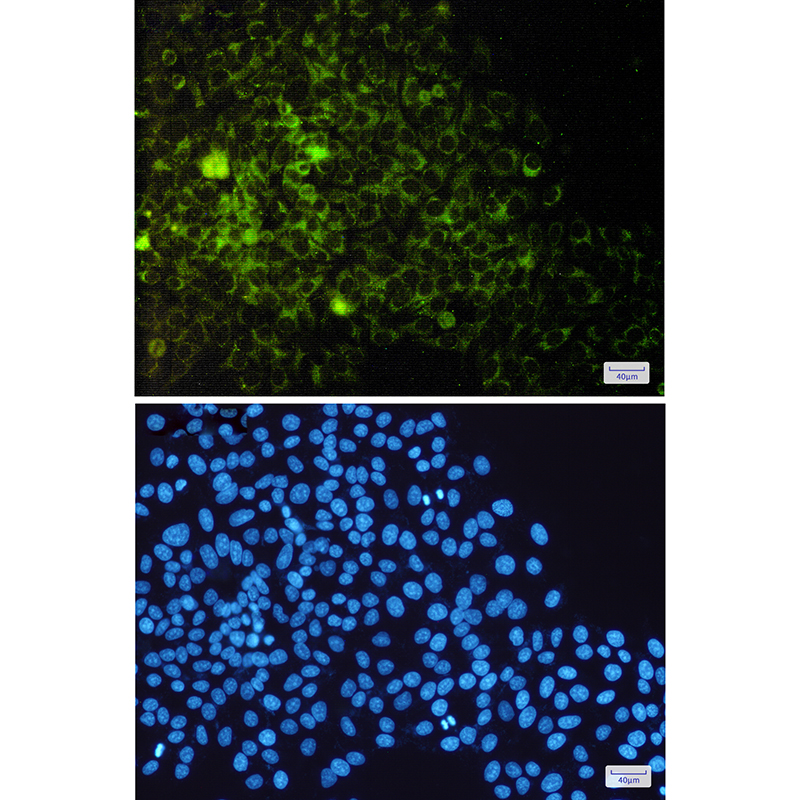 Immunocytochemistry analysis of CD9(green) in Hela using CD9 antibody,and DAPI(blue) |
