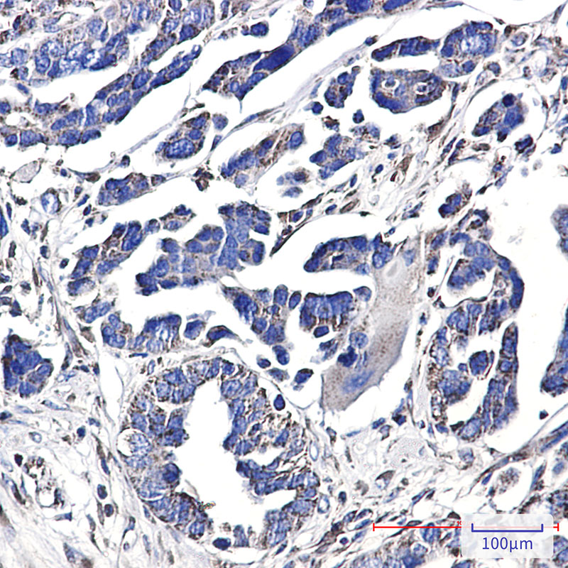 Immunohistochemistry analysis of paraffin-embedded Human Cholangiocarcinoma using CD9 antibody. High-pressure and temperature Sodium Citrate pH 6.0 was used for antigen retrieval. |
