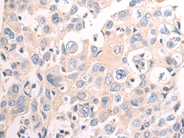 The image is immunohistochemistry of paraffin-embedded Human cervical cancer tissue using P07179(CDC25A Antibody) at dilution 1/75. (Original magnification: ×200) |