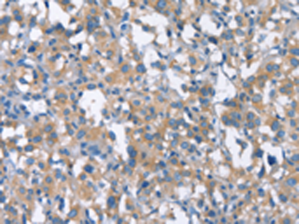 The image is immunohistochemistry of paraffin-embedded Human gasrtic cancer tissue using P11259(CDC25A Antibody) at dilution 1/50. (Original magnification: ×200) |