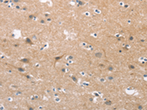 The image is immunohistochemistry of paraffin-embedded Human brain tissue using P04351(CDC25B Antibody) at dilution 1/45. (Original magnification: ×200) |