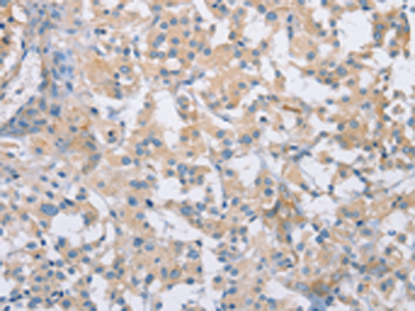 The image is immunohistochemistry of paraffin-embedded Human thyroid cancer tissue using P04769(CDCP1 Antibody) at dilution 1/50. (Original magnification: ×200) |
