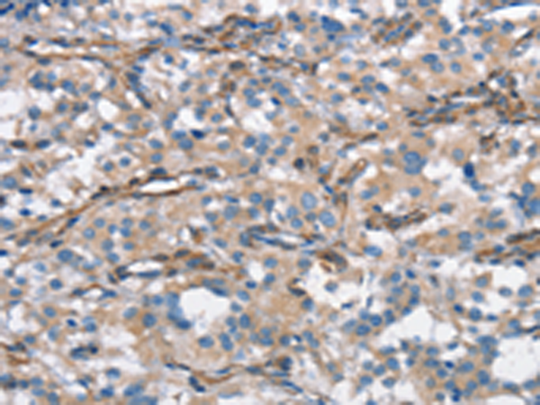 The image is immunohistochemistry of paraffin-embedded Human thyroid cancer tissue using P04347(CEACAM3 Antibody) at dilution 1/30. (Original magnification: ×200) |
