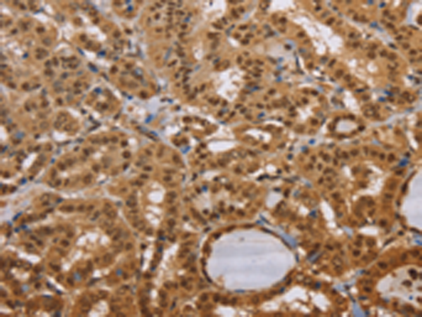 The image is immunohistochemistry of paraffin-embedded Human thyroid cancer tissue using P04718(CEL Antibody) at dilution 1/40. (Original magnification: ×200) |