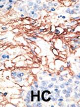 Formalin-fixed and paraffin-embedded human cancer tissue reacted with the primary antibody, which was peroxidase-conjugated to the secondary antibody, followed by AEC staining. This data demonstrates the use of this antibody for immunohistochemistry; clinical relevance has not been evaluated. BC = breast carcinoma; HC = hepatocarcinoma. |