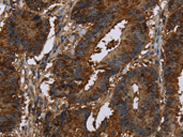 The image is immunohistochemistry of paraffin-embedded Human colon cancer tissue using P05013(CERS5 Antibody) at dilution 1/40. (Original magnification: ×200) |