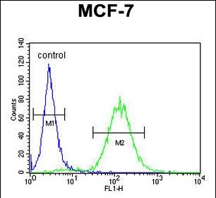 CES2 Antibody (Center) (Cat. #P30823) flow cytometric analysis of MCF-7 cells (right histogram) compared to a negative control cell (left histogram).FITC-conjugated goat-anti-rabbit secondary antibodies were used for the analysis. |