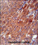 CES2 antibody (Center) (Cat. #P30823) immunohistochemistry analysis in formalin fixed and paraffin embedded human hepatocarcinoma followed by peroxidase conjugation of the secondary antibody and DAB staining. This data demonstrates the use of the CES2 antibody (Center) for immunohistochemistry. Clinical relevance has not been evaluated. |