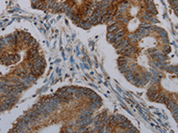 The image is immunohistochemistry of paraffin-embedded Human colon cancer tissue using P04881(CFLAR Antibody) at dilution 1/20. (Original magnification: ×200) |