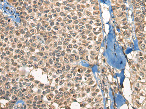 The image is immunohistochemistry of paraffin-embedded Human ovarian cancer tissue using P13137(CHFR Antibody) at dilution 1/20. (Original magnification: ×200) |
