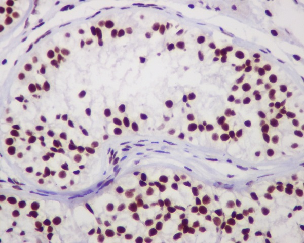 Immunohistochemistry analysis of paraffin-embedded Human testis using Chk2 antibody.High-pressure and temperature Sodium Citrate pH 6.0 was used for antigen retrieval. |