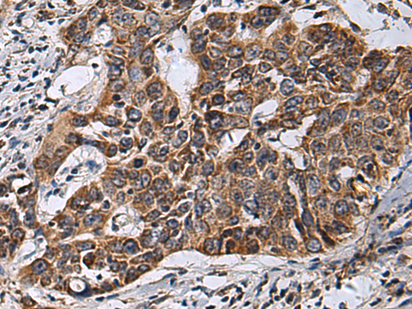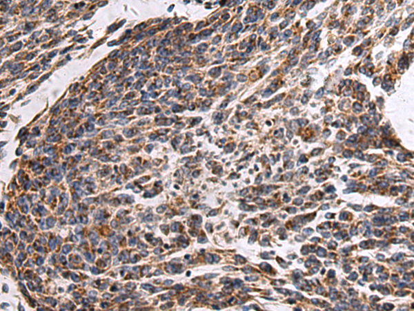 The image is immunohistochemistry of paraffin-embedded Human esophagus cancer tissue using P04127(CHRNA1 Antibody) at dilution 1/25. (Original magnification: ×200) |