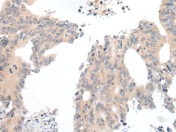 The image is immunohistochemistry of paraffin-embedded Human colorectal cancer tissue using P12688(CHRNA5 Antibody) at dilution 1/20. (Original magnification: ×200) |